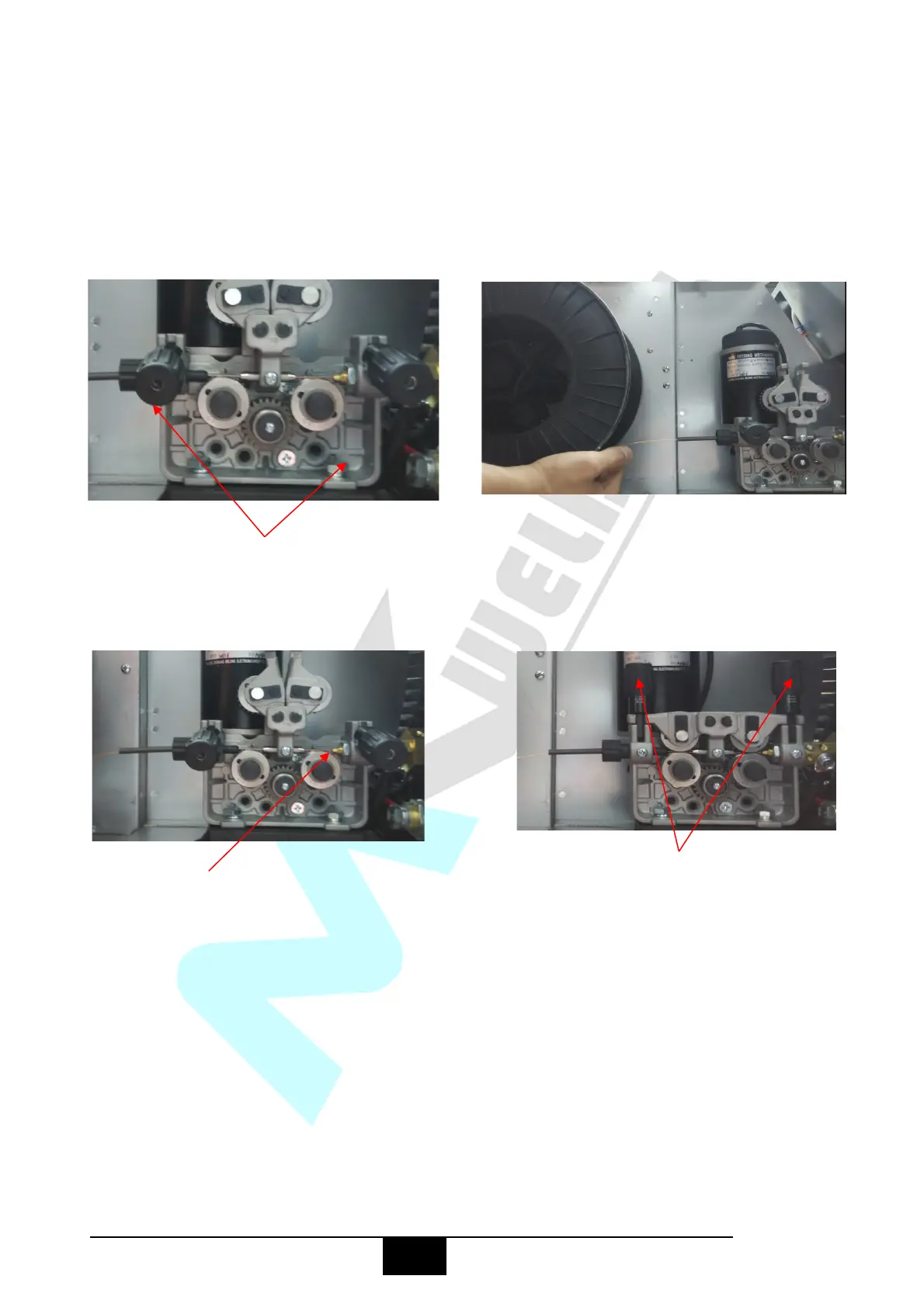 (10) Feed wire over the drive roller into the outlet (11) Close down the top roller bracket