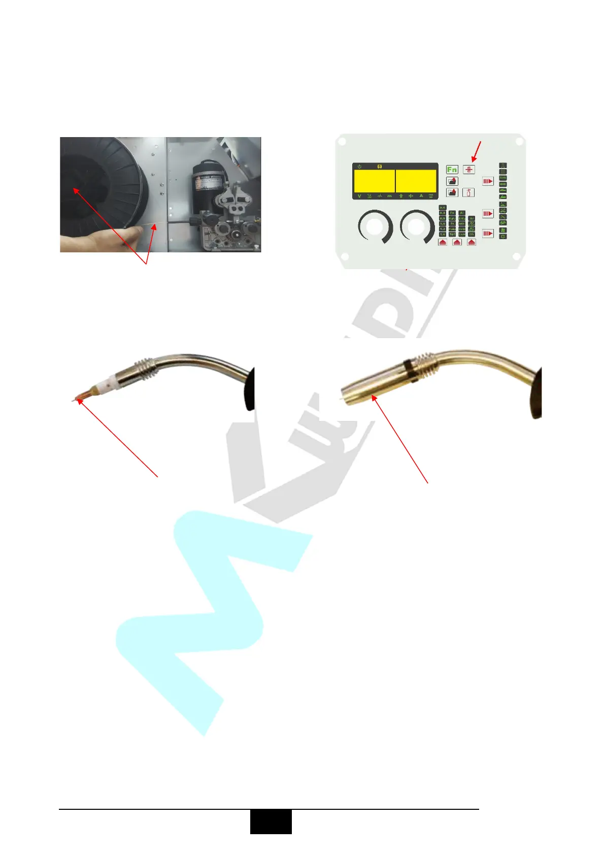 (11) Place aluminium wire onto spool holder. (12) Press and hold the manual wire button