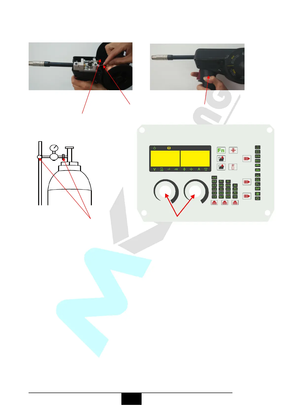 (13) Carefully open the gas cylinder valve (14) Set welding parameters using the knobs.