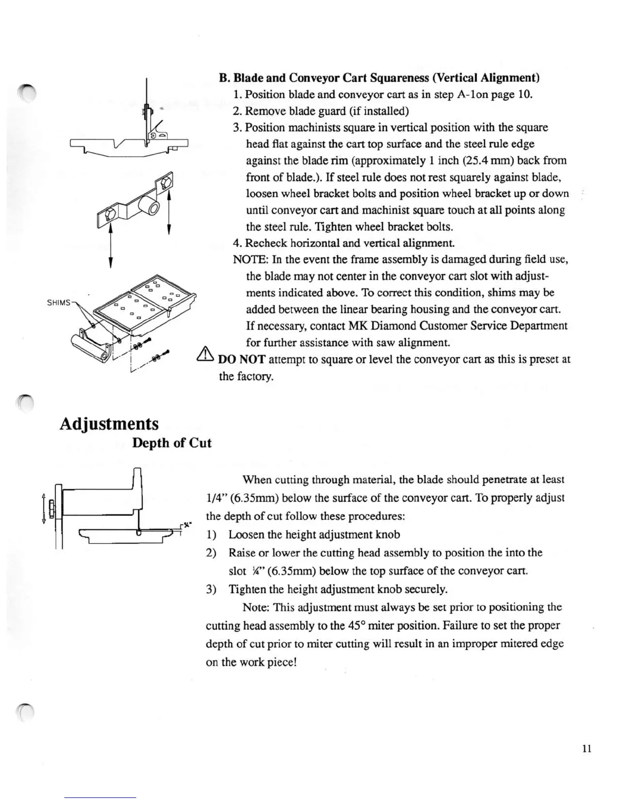 MK 660 - Blade and Conveyor Cart Squareness (Vertical Alignment); Adjustments; Depth of Cut
