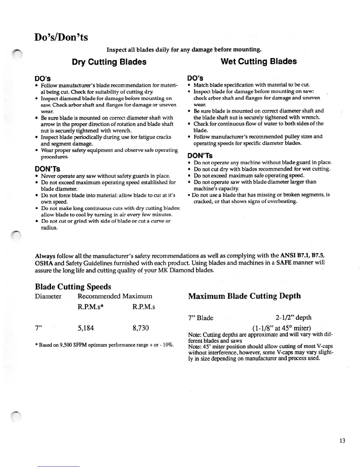 MK 660 - Dos;Donts; Dry Cutting Blade Guidelines; Wet Cutting Blade Guidelines
