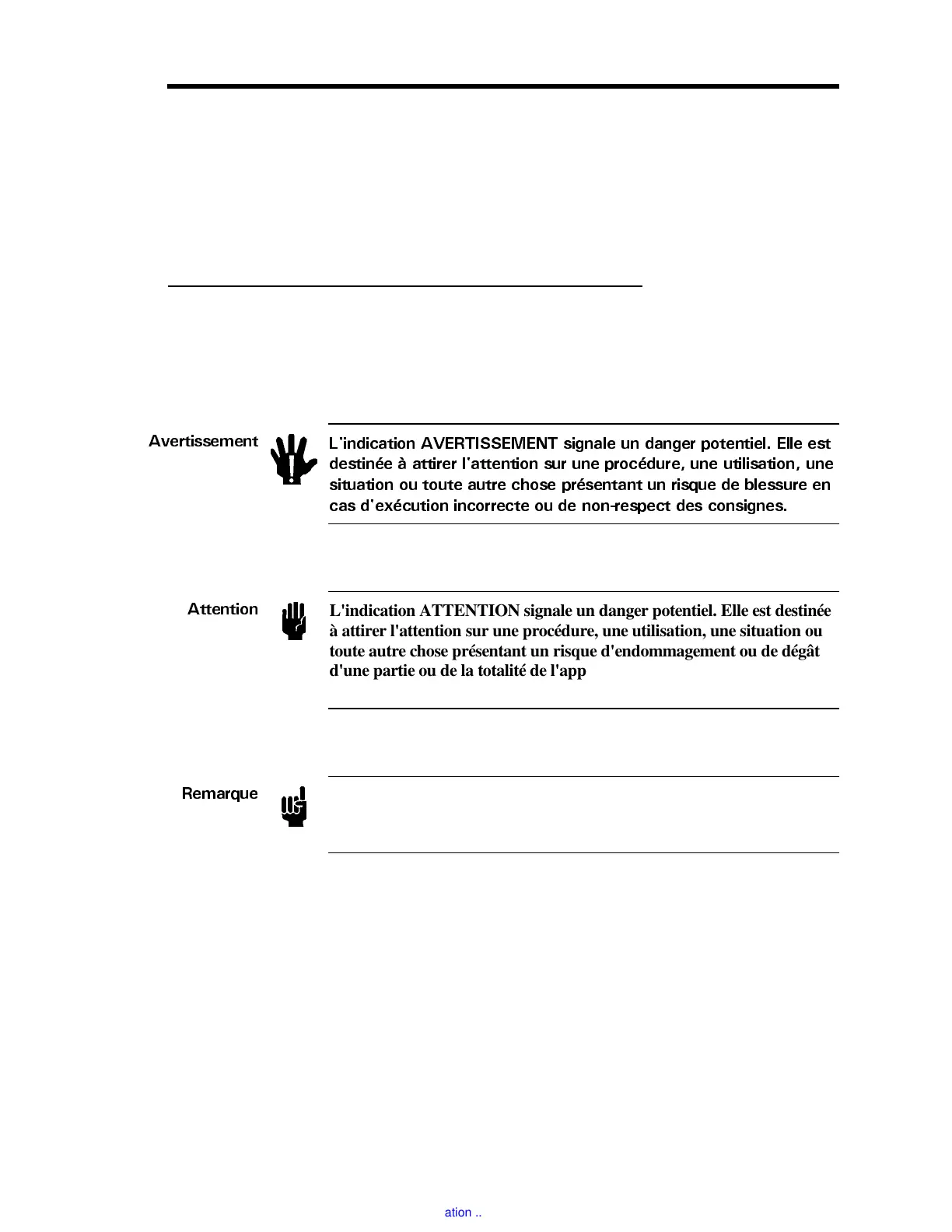 Définition des indications AVERTISSEMENT, ATTENTION et REMARQUE utilisées dans ce