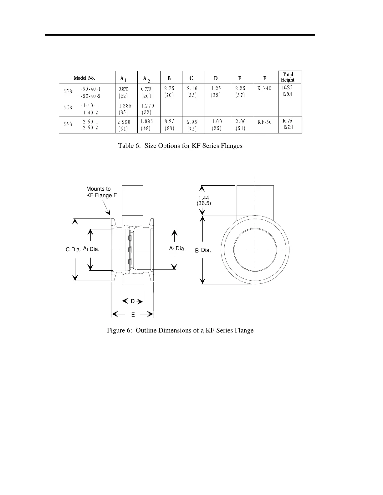 MKS 653B - KF Series Flanges; Figure 6: Outline Dimensions of a KF Series Flange; Table 6: Size Options for KF Series Flanges