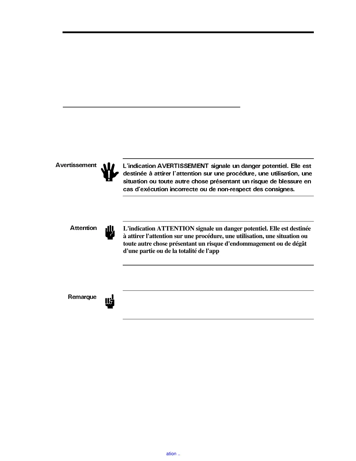 L'indication ATTENTION signale un danger potentiel. Elle est destinée