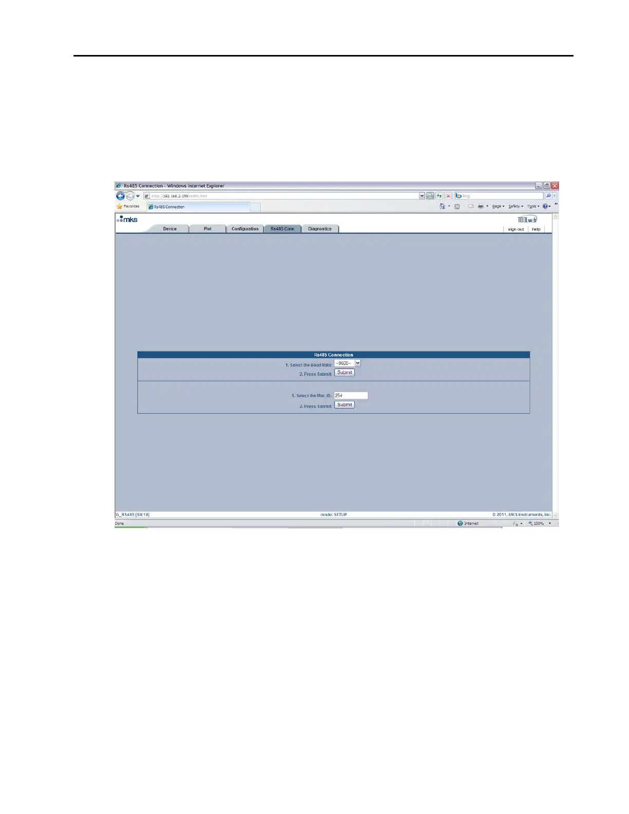 This page displays the Baud Rate and MacID settings for the RS485 MFC. In “Monitor Mode” you are able to