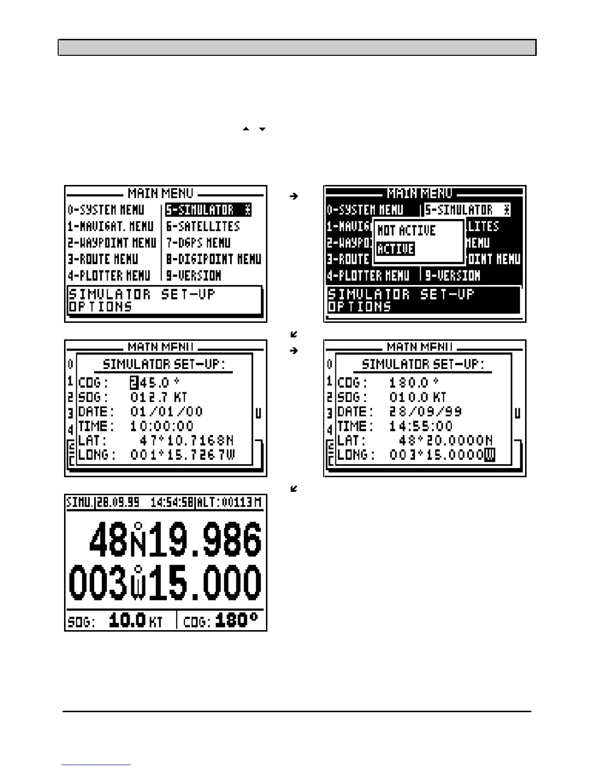 To activate the SIMULATOR function, from the MAIN MENU, press key 5 (or select 5-
