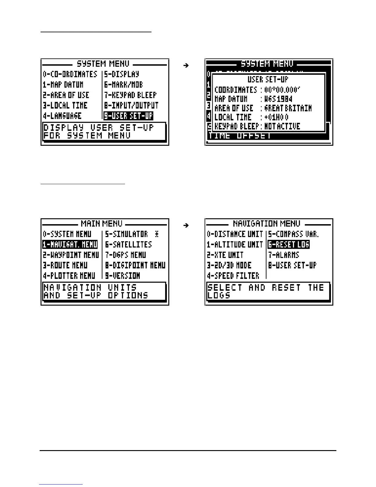 From MAIN MENU, press key 1 (or select 1-NAVIGAT.MENU and press
