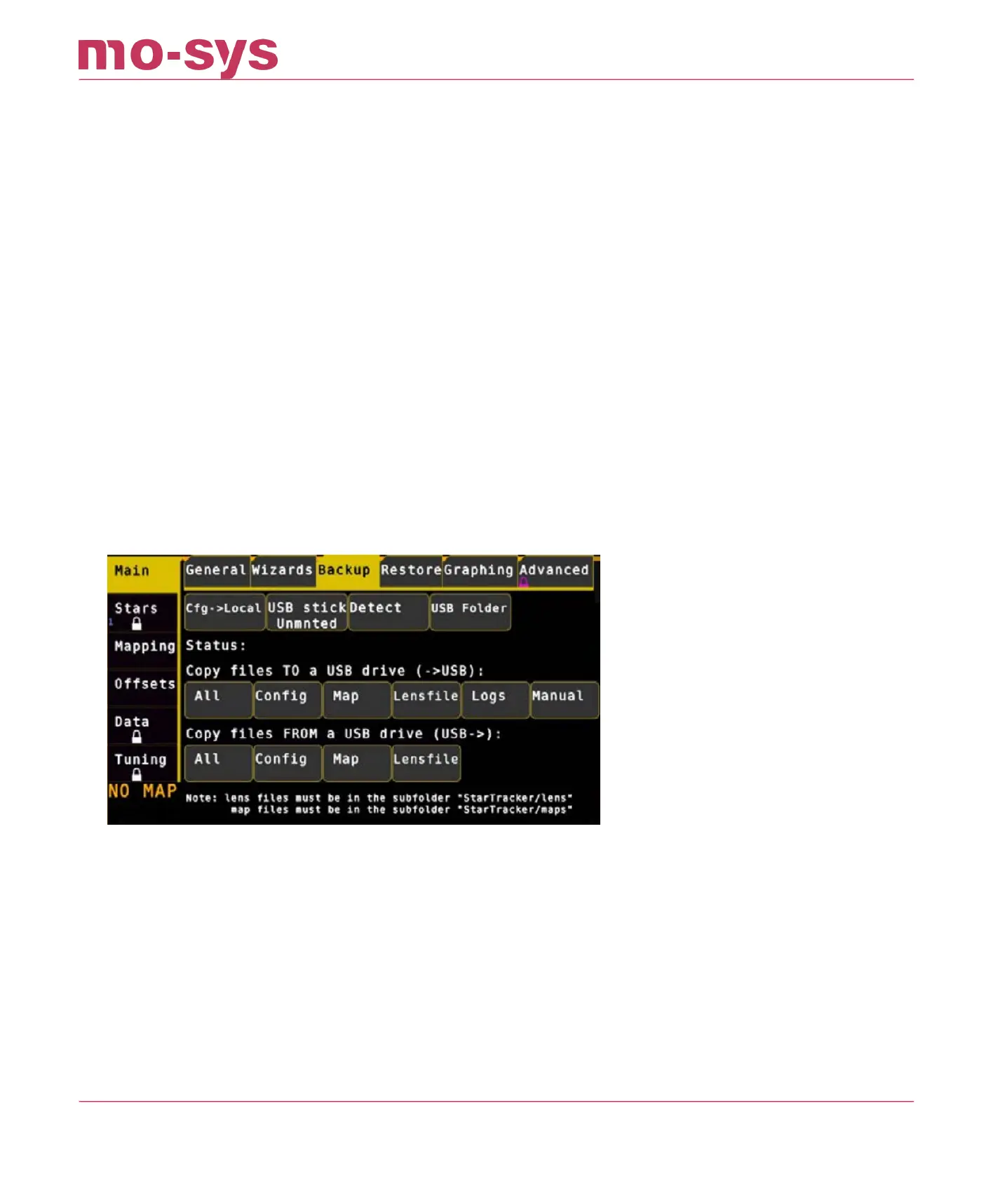 Backup maps, cong les, logs and user manual to/ from USB stick. Insert a USB memory stick