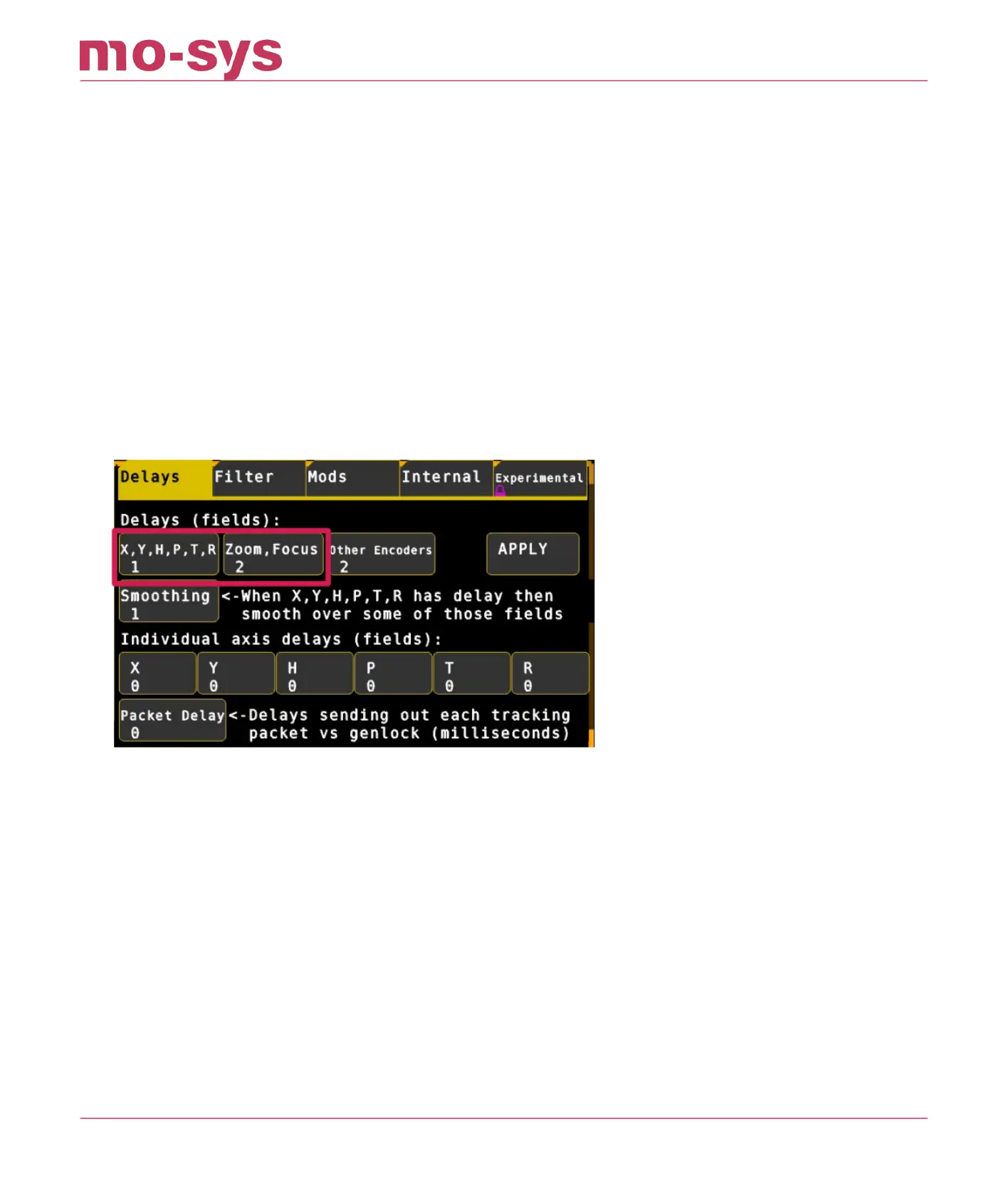Having set the delay for all axes you will then need to set the lens delay choosing Tuning →