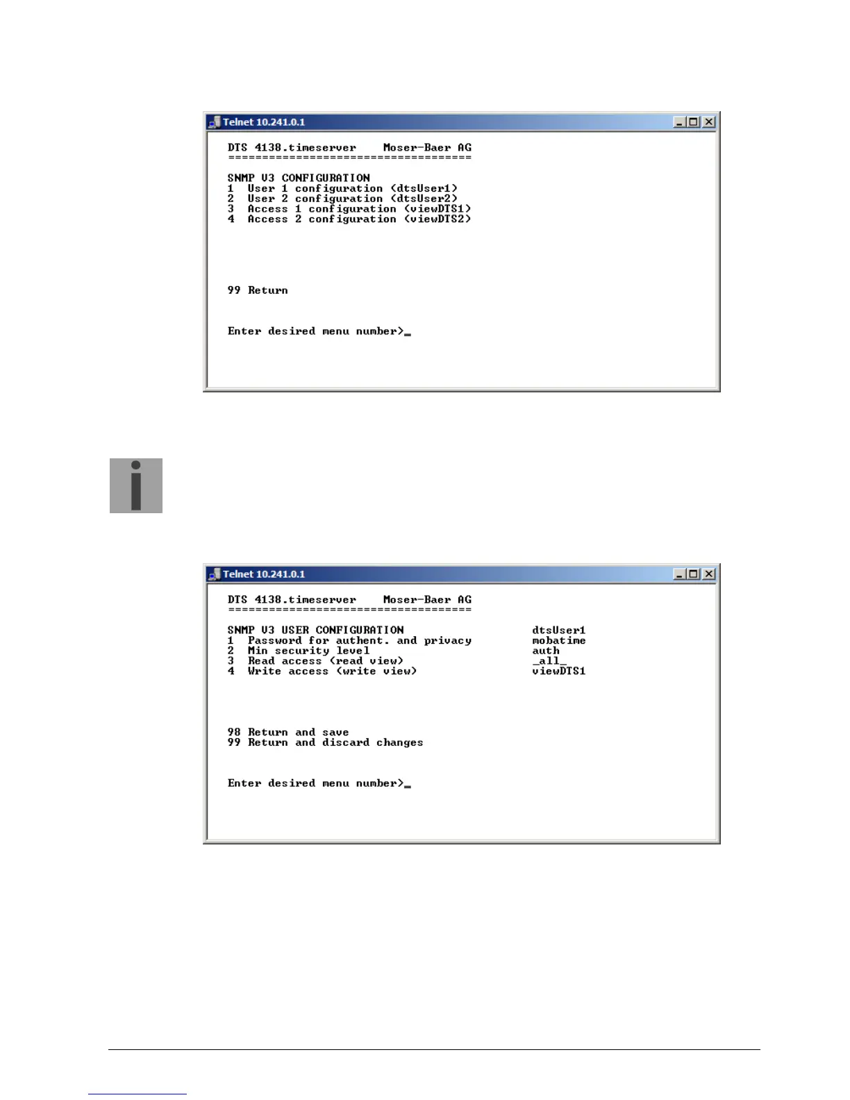 1. – 2. Configuration of user-defined SNMP accounts dtsUser1 and dtsUser2