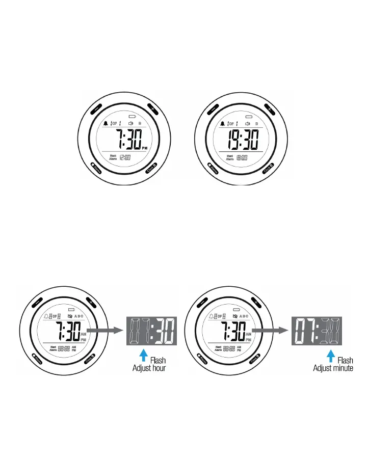 Press and hold the CLOCK button for (2) seconds to switch between 12