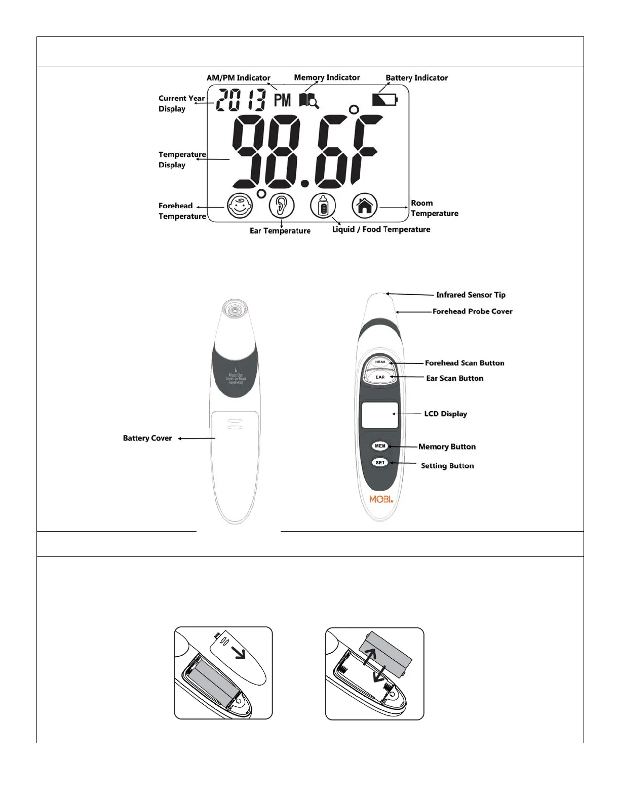 Remove the battery cover by sliding it toward the bottom of the thermometer