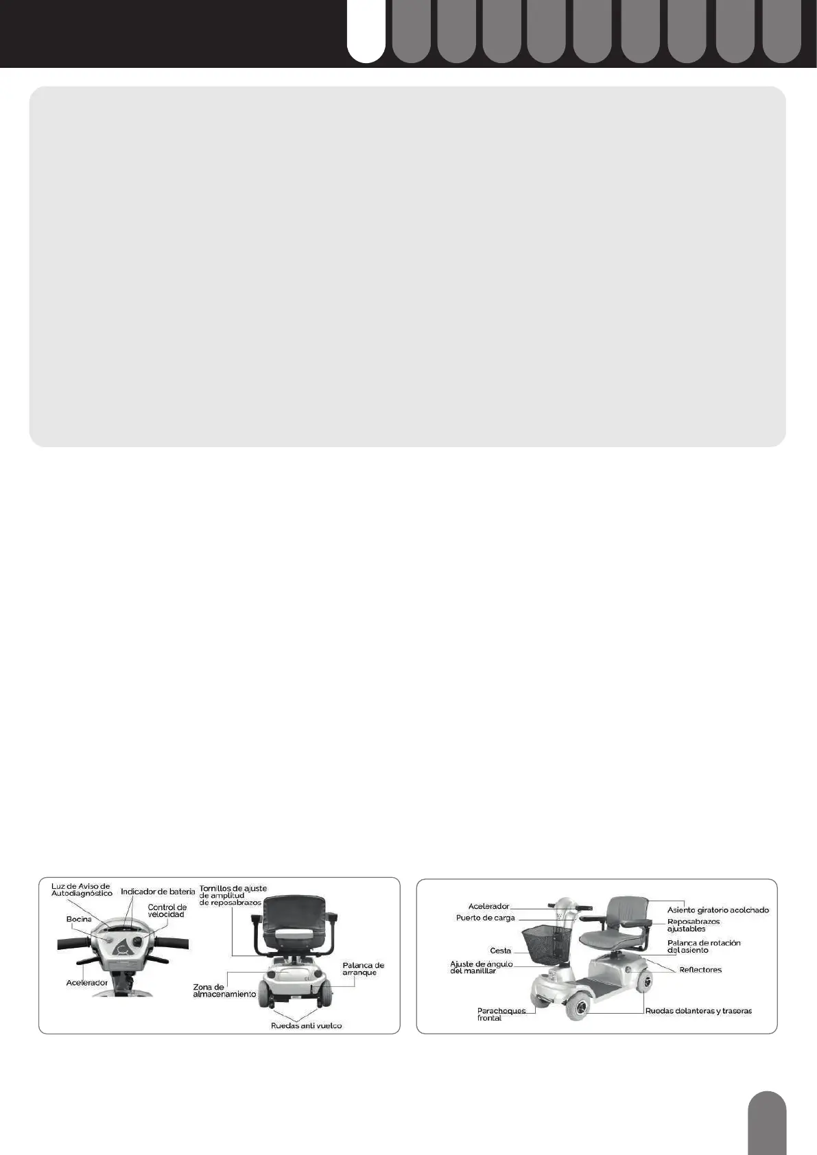 Antes de usar el scooter, es importante que conozca las partes que lo conforman y el funcionamiento de los mandos