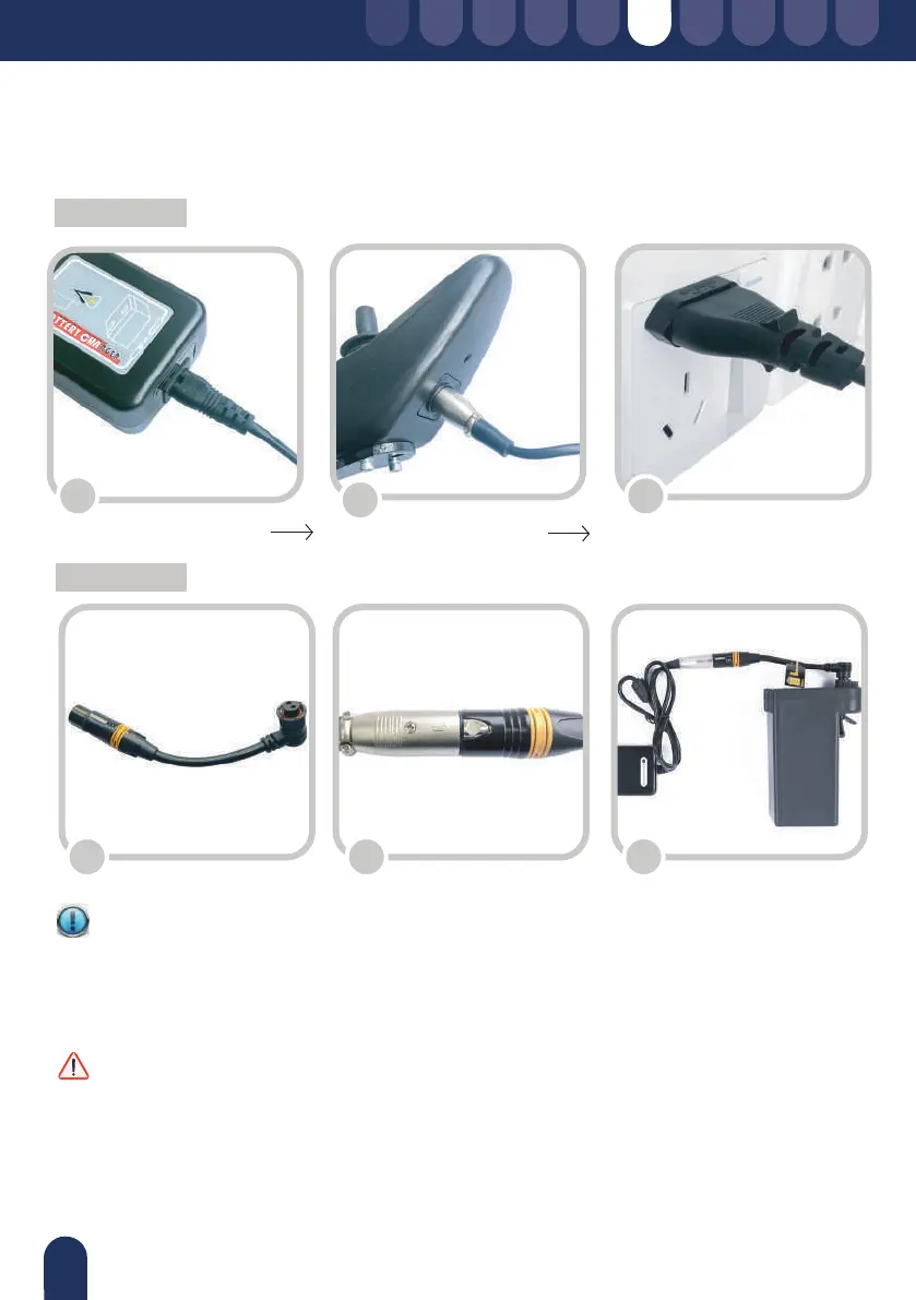 1 Ligar o carregador 2 Ligar o joystick 3. Ligar à tomada principal