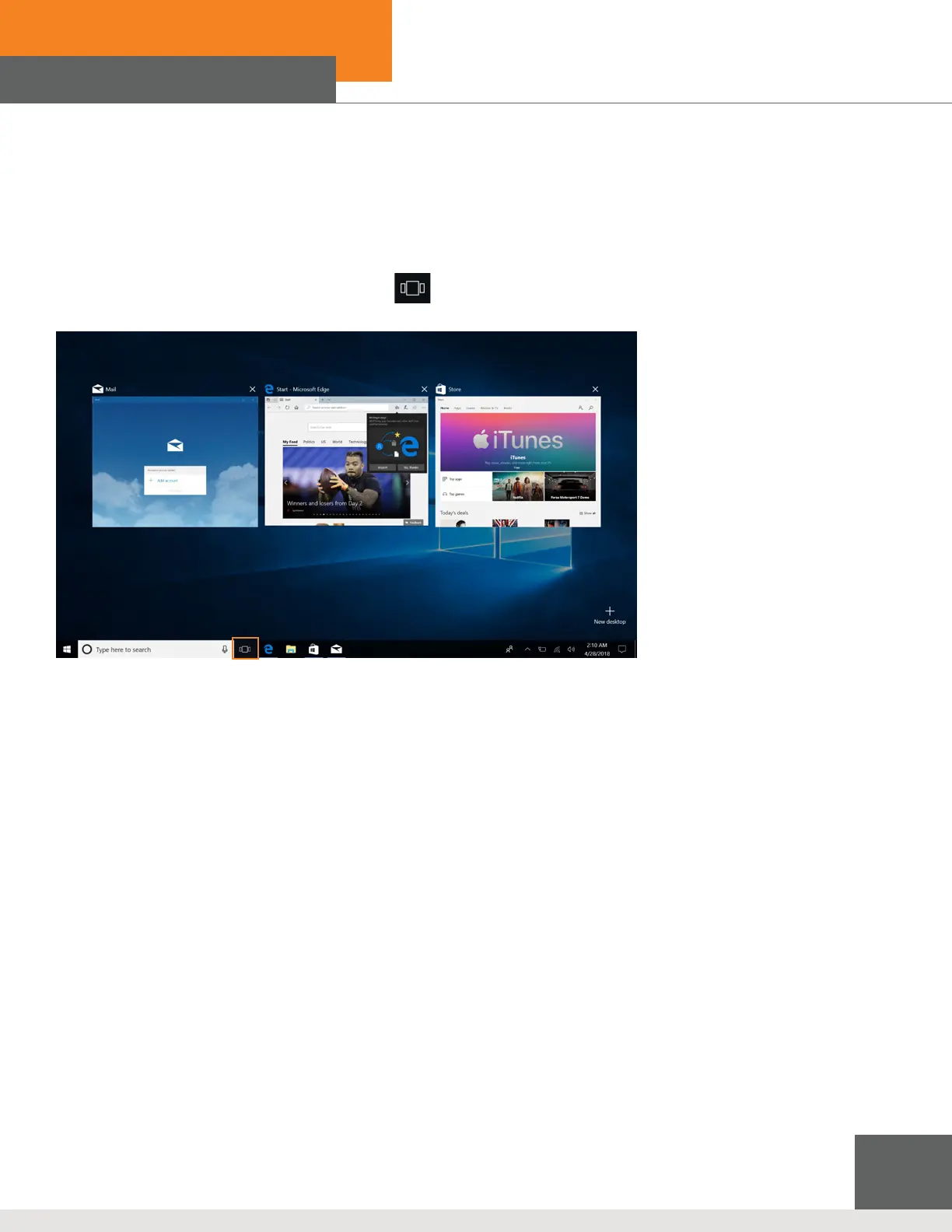 If you Click the Task View(or press the icon ), the running applications will be display. We can enter