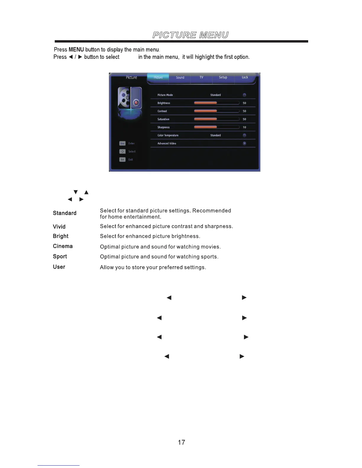 Adjust to sharpen or soften the picture. Press to soften the picture. Press to sharpen the picture.