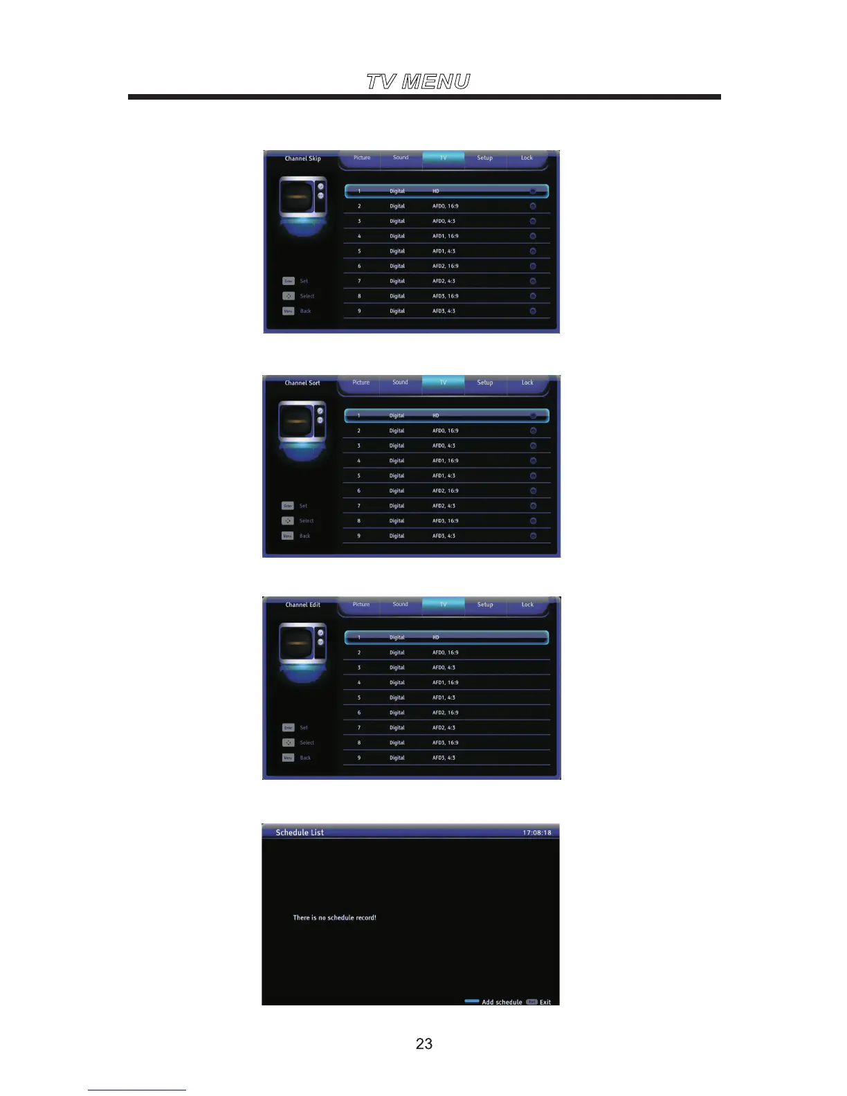 Mobilline TV-C16DDS - Channel Sort; Schedule List