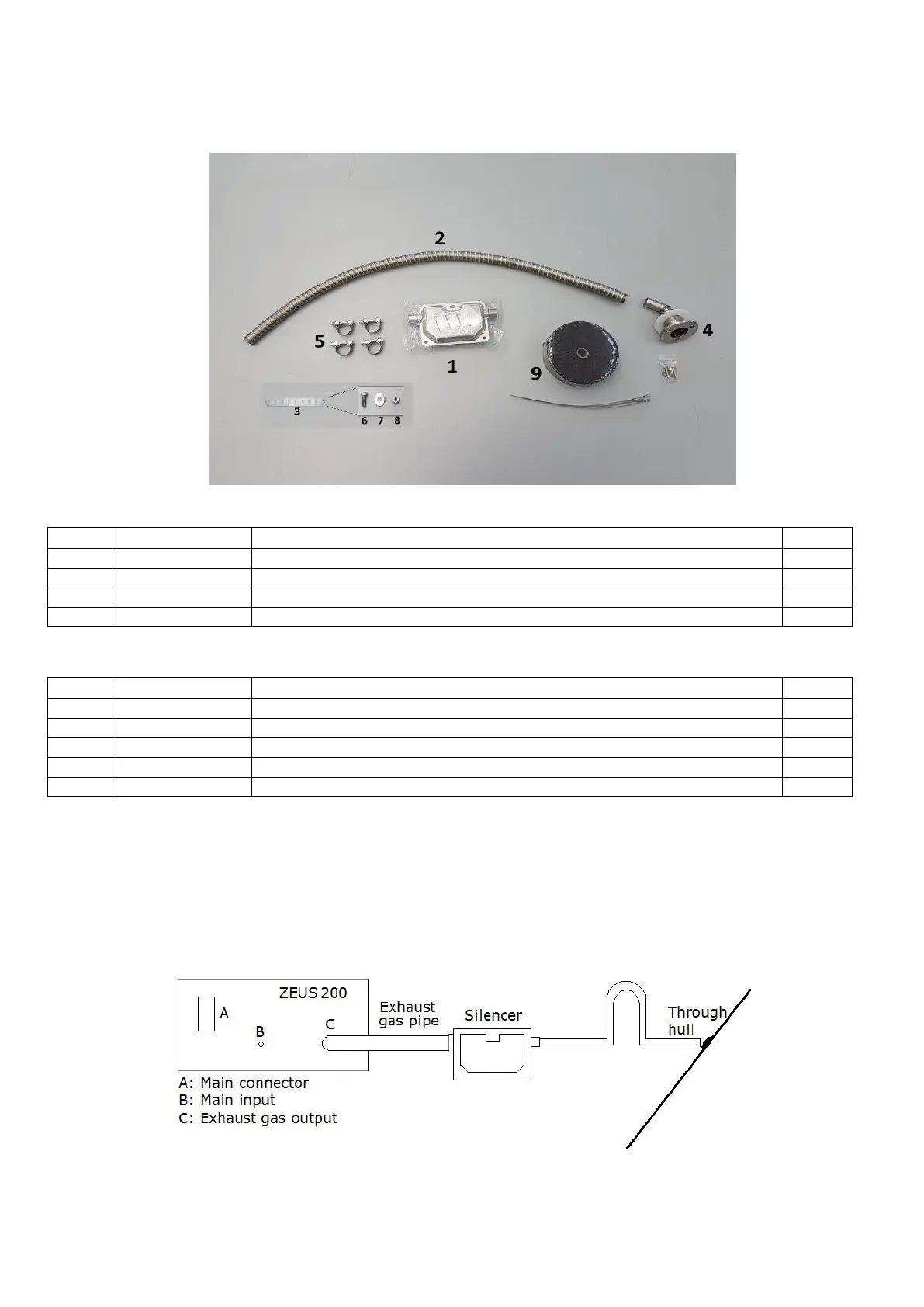 3. Connect the supplied steel tube (2) of 28mm L2mt. between the Zeus200 generator outlet (C)