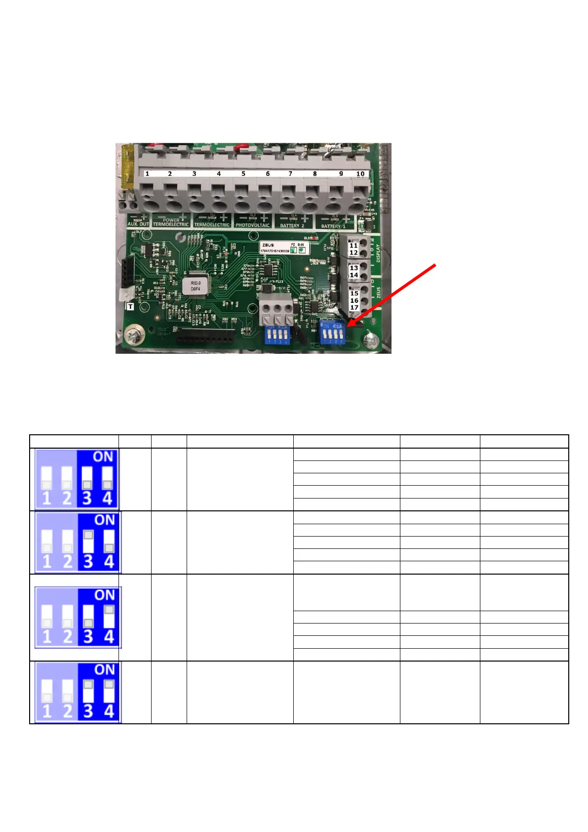 The primary battery type (services) is set using the third and fourth switches, as shown in the