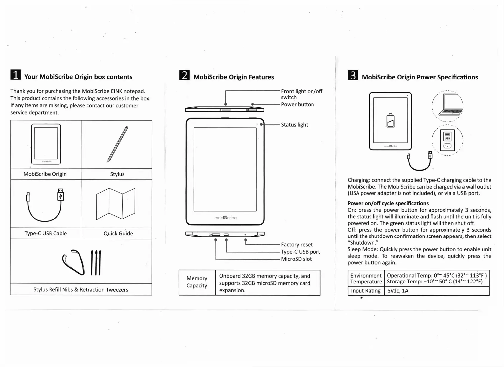 MobiScribe Origin - Your MobiScribe Origin box contents; Box Contents Overview; MobiScribe Origin Features; Key Device Features