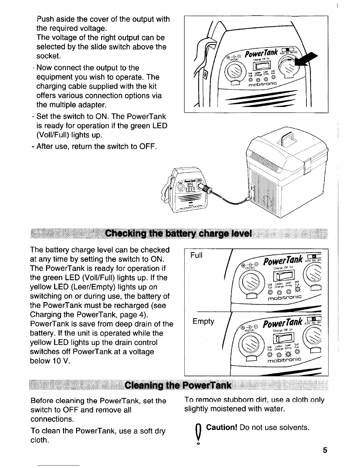 Mobitronic PowerTank - Checking the Battery Charge Level; Cleaning the PowerTank; Cleaning Instructions