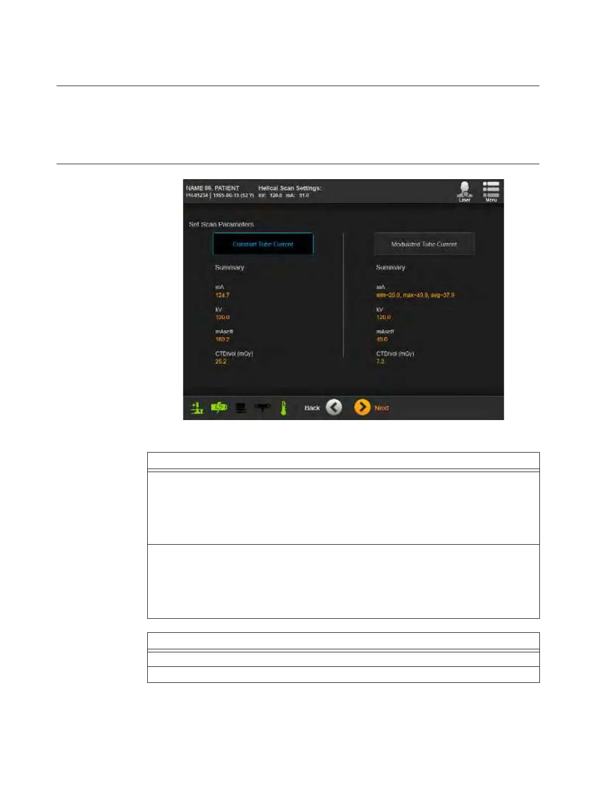 Region), select either Constant Tube Current or Modulated Tube Current. The summaries list the
