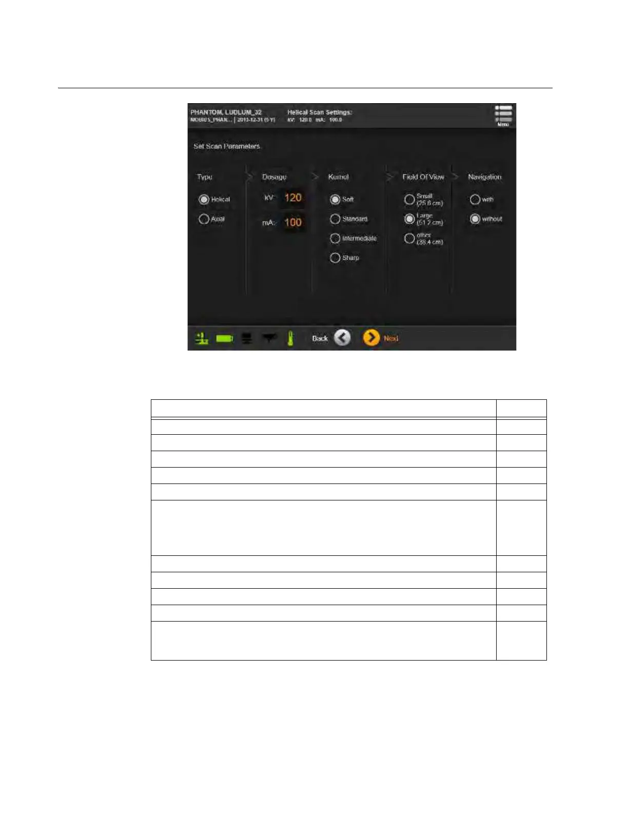 NOTE: For Dosage, only use kV values of 80, 100, or 120 kV, and mA values