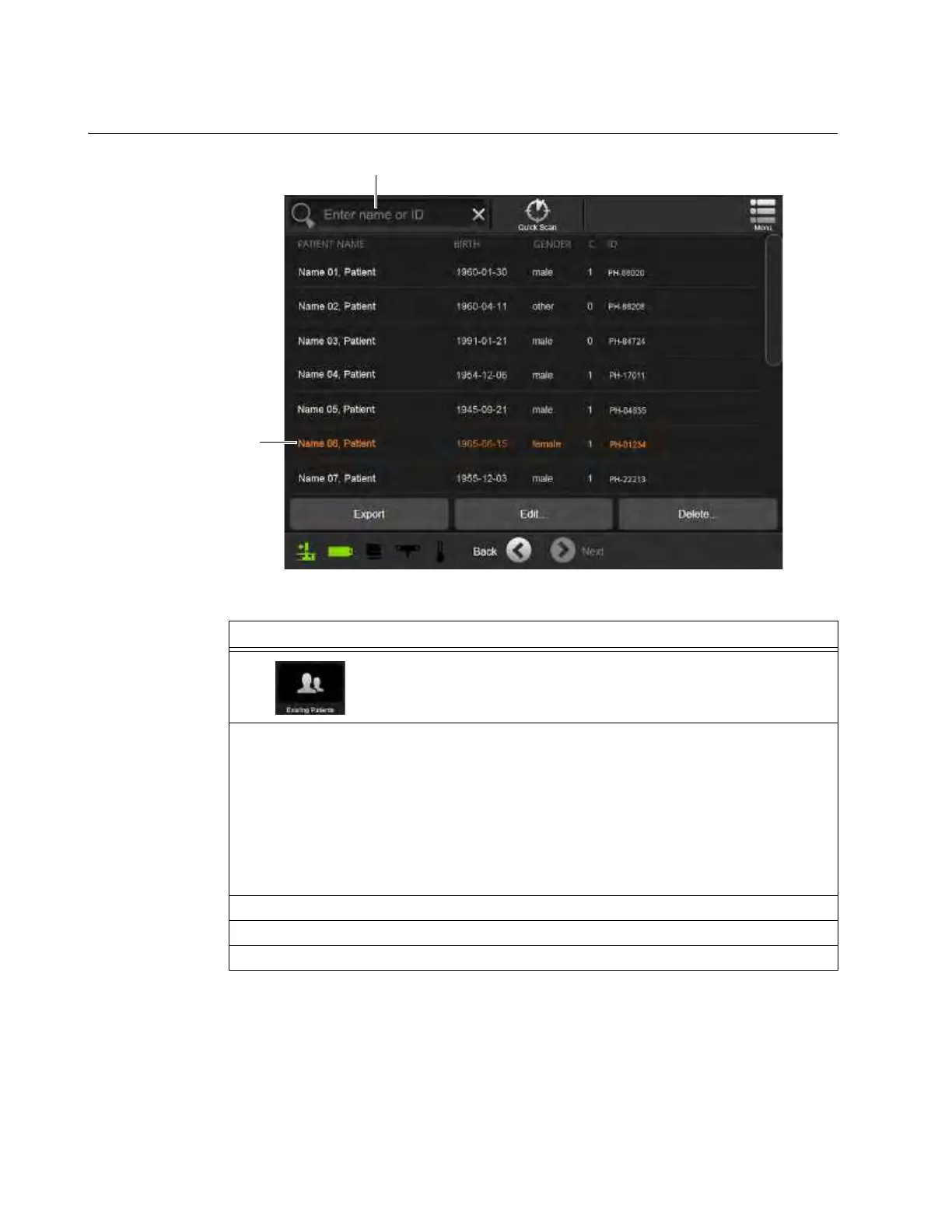 Select Existing Patients from the Patient Data Screen. See section