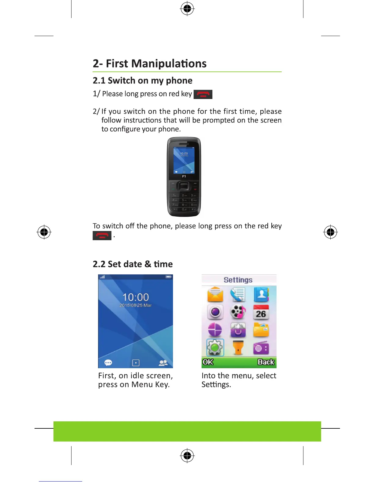 MOBIWIRE F1 - 2. First Manipulations; 2.1 Switch on my phone; 2.2 Set date & time