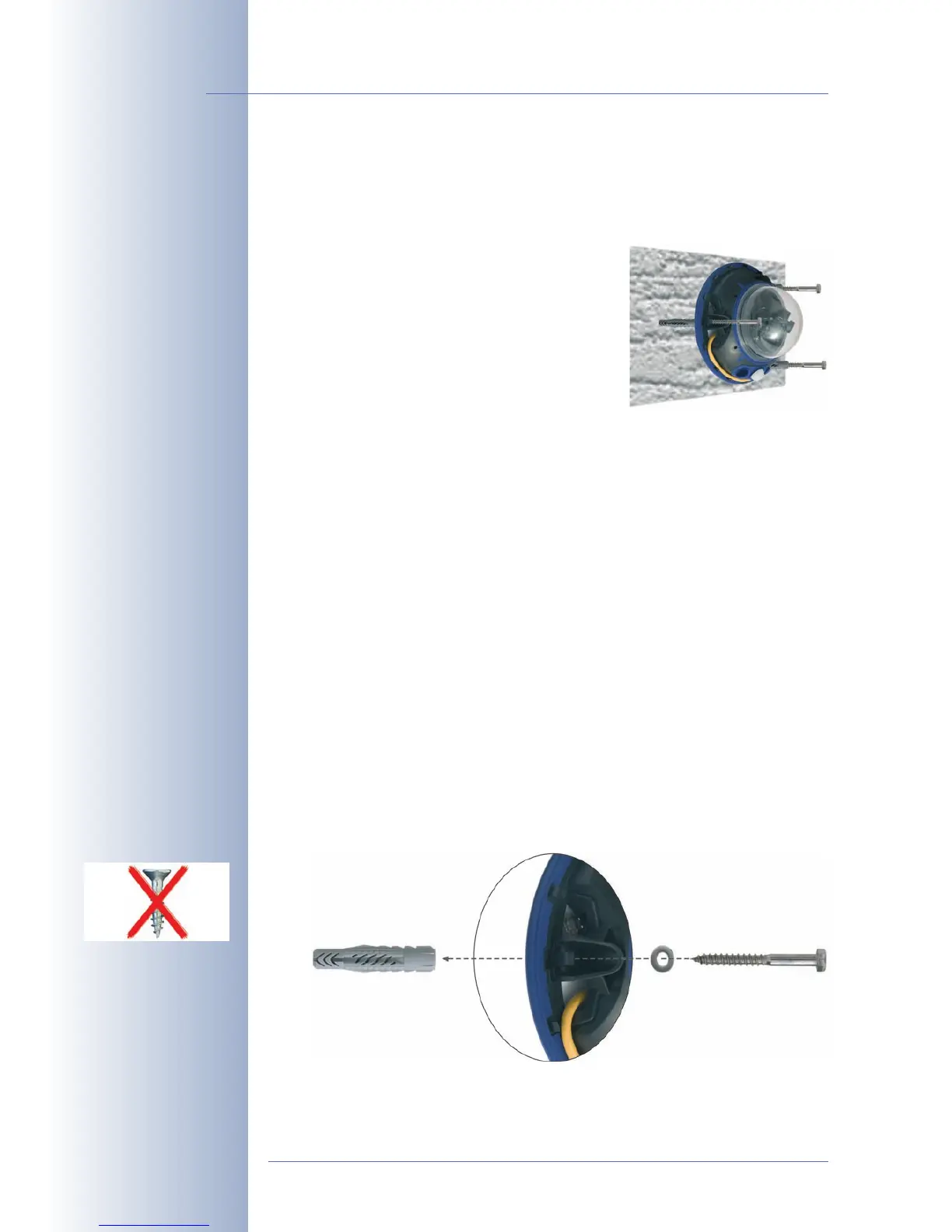 Use the supplied materials and suitable tools for mounting the camera to a dry-