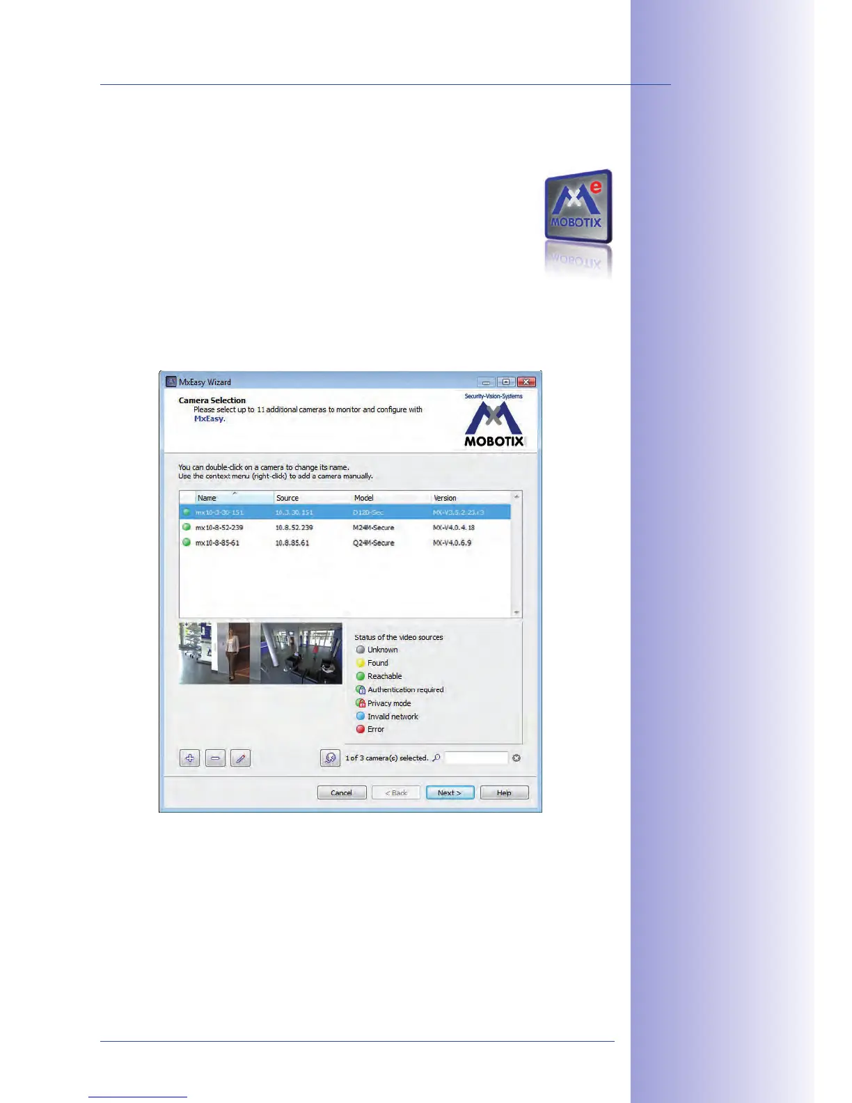 begins to search for MOBOTIX cameras, and displays all cameras found in a list. The