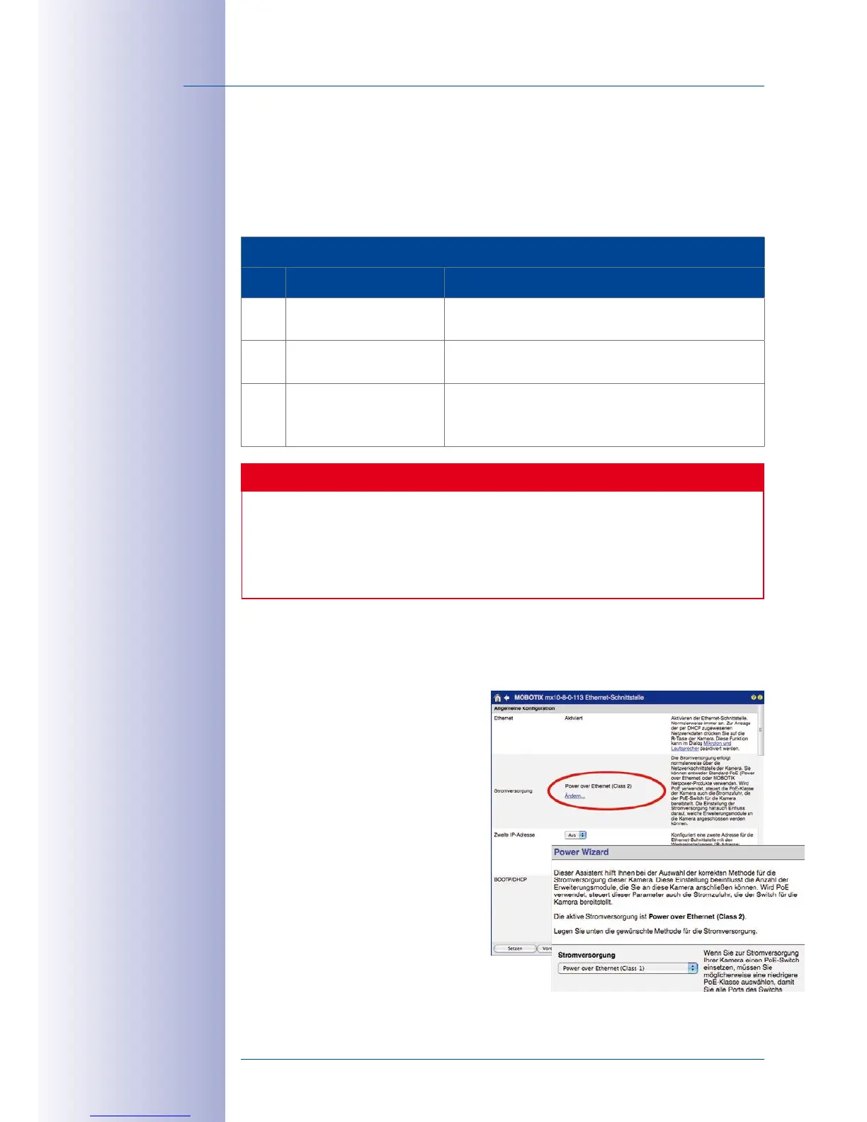 peripheral devices connected (see table). PoE classes 1, 2 or 3 may be selected in the