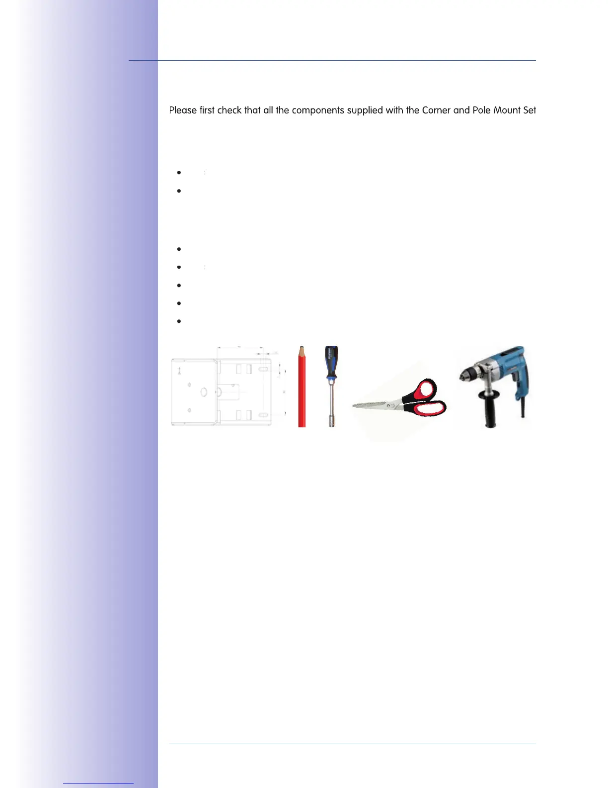 Please first check that all the components supplied with the Corner and Pole Mount Set
