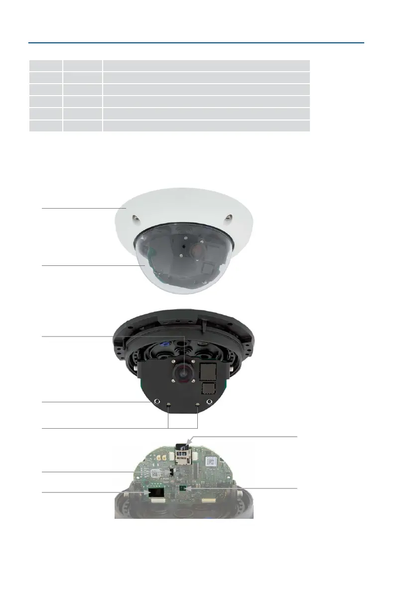 The MOBOTIX D26 consists of the camera housing (mainboard, lens, dome), the outer shell