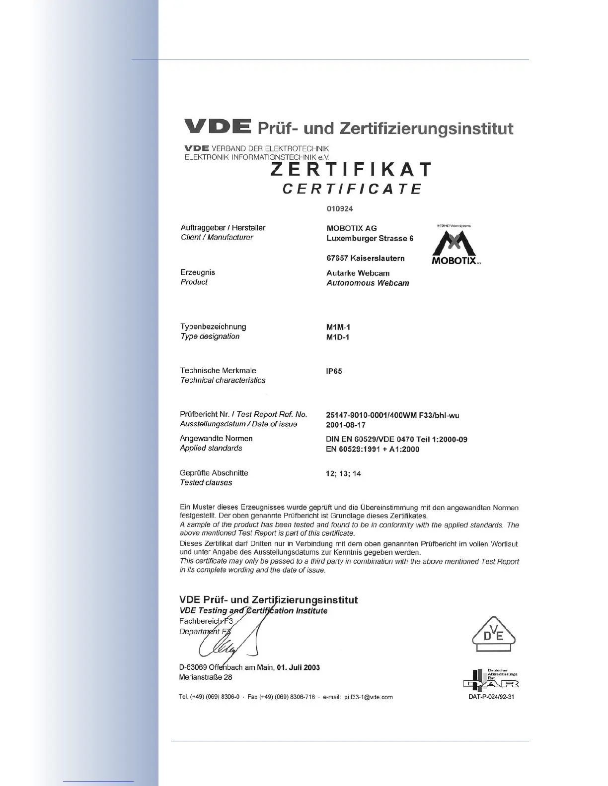 IP65 Certificate