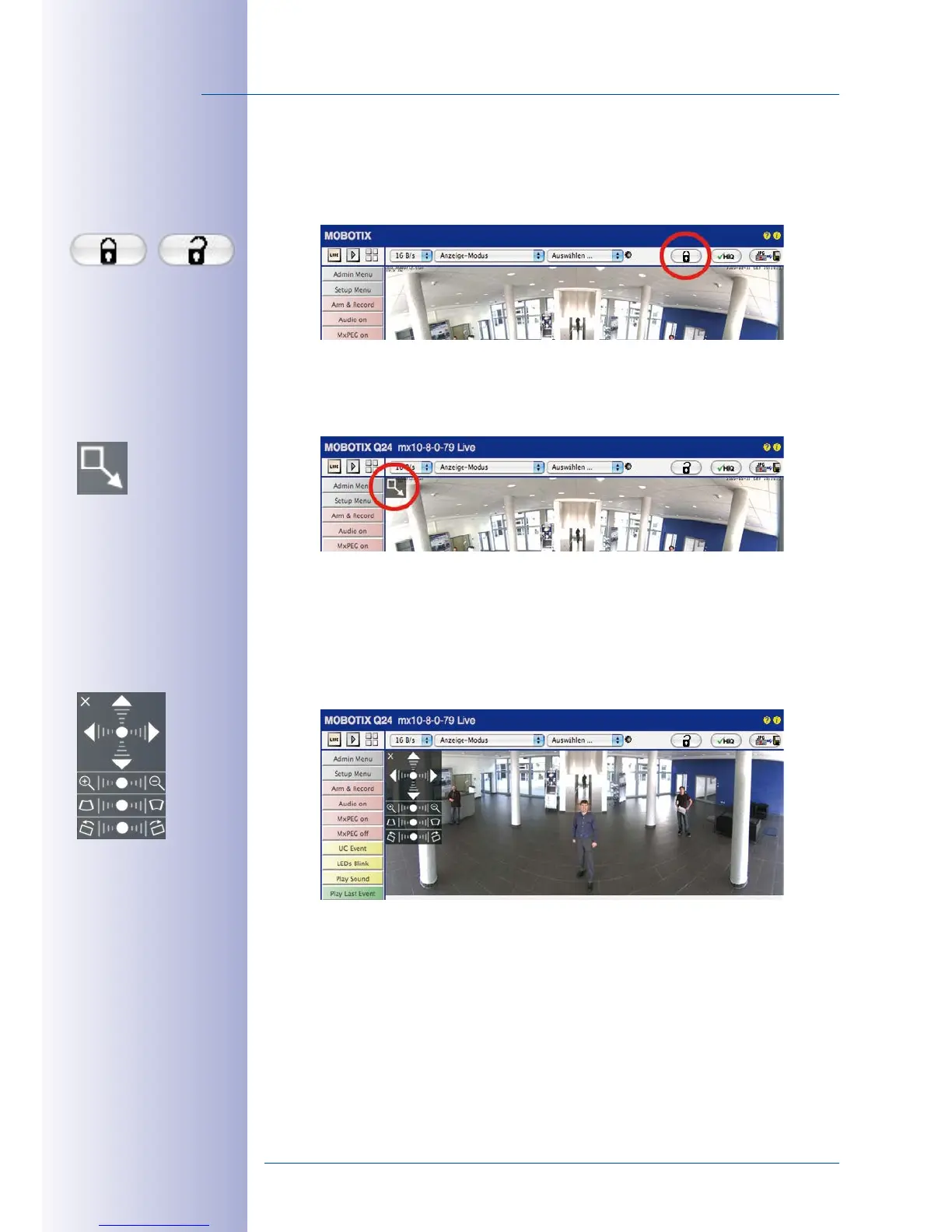 the displayed live camera image as desired (panning, tilting, zooming, rotating