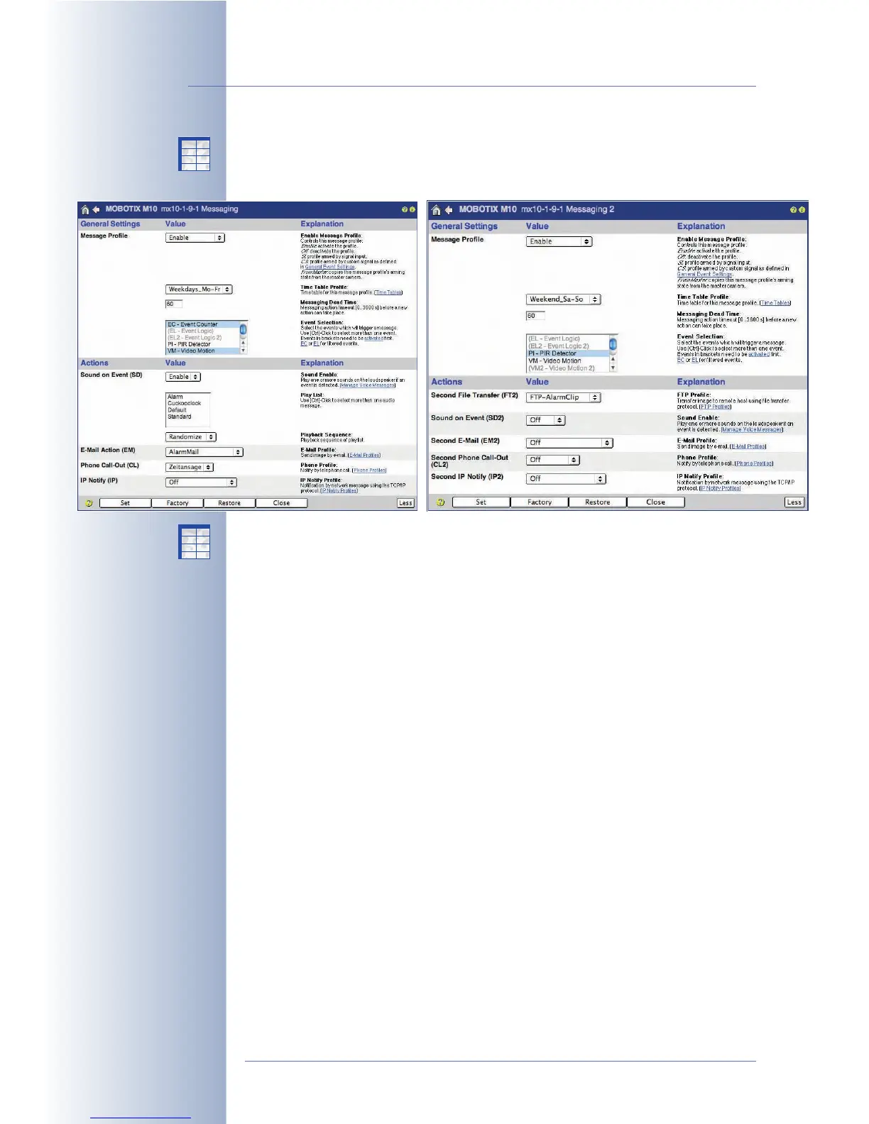 The Setup Menu > Messaging 2 dialog allows defining different actions and mes-