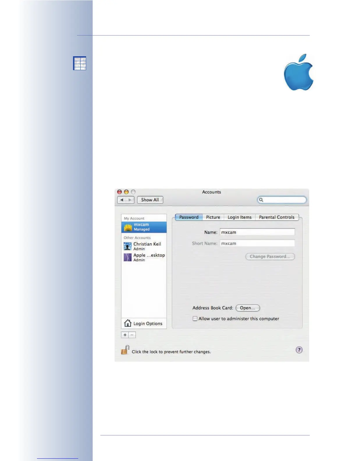The camera will use this user name later on to log onto the Mac OS X com-