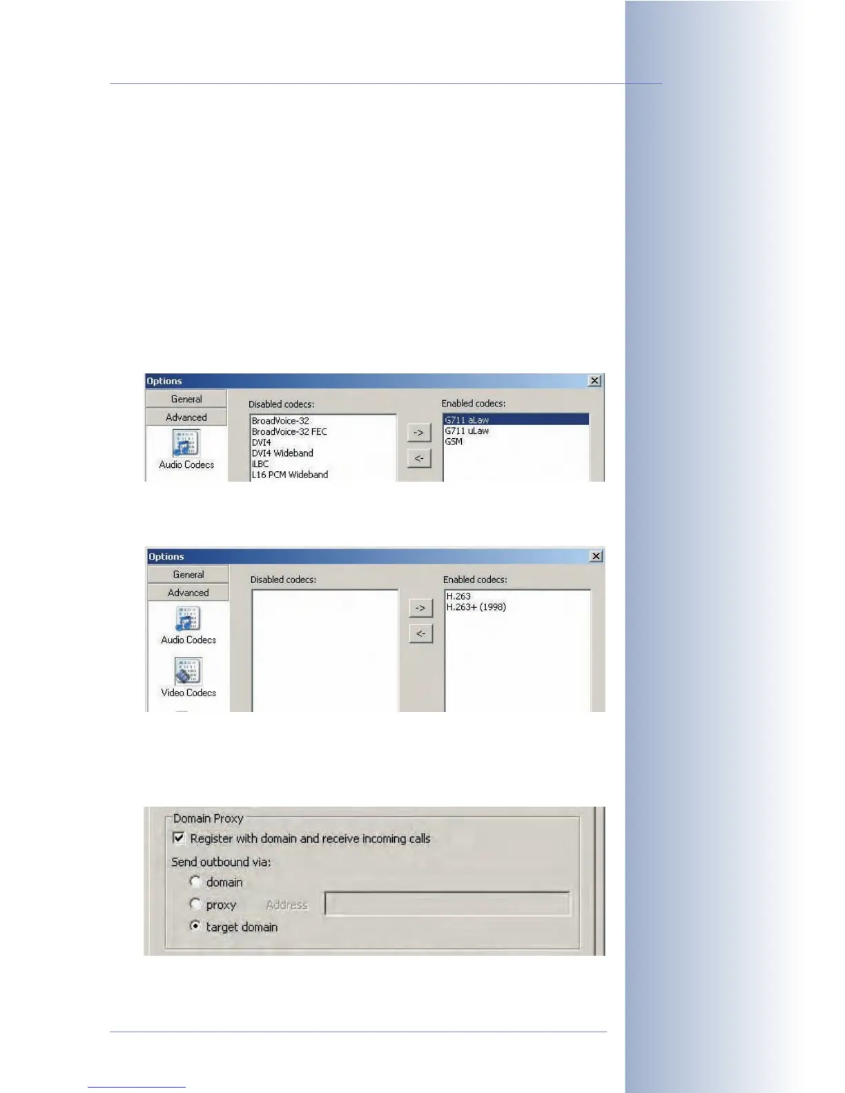 camera have been enabled: G711 aLaw, G711 uLaw and GSM.