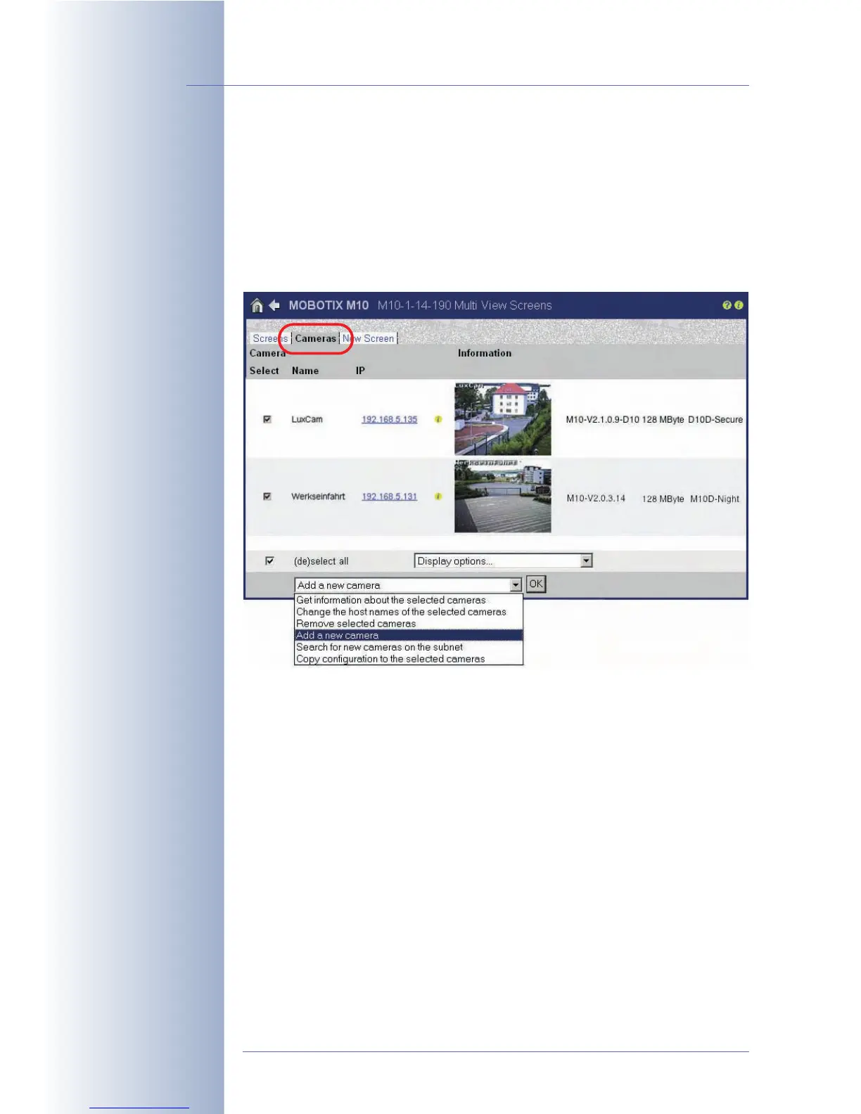 Menu > MultiView Screens > Cameras, see figure). Select