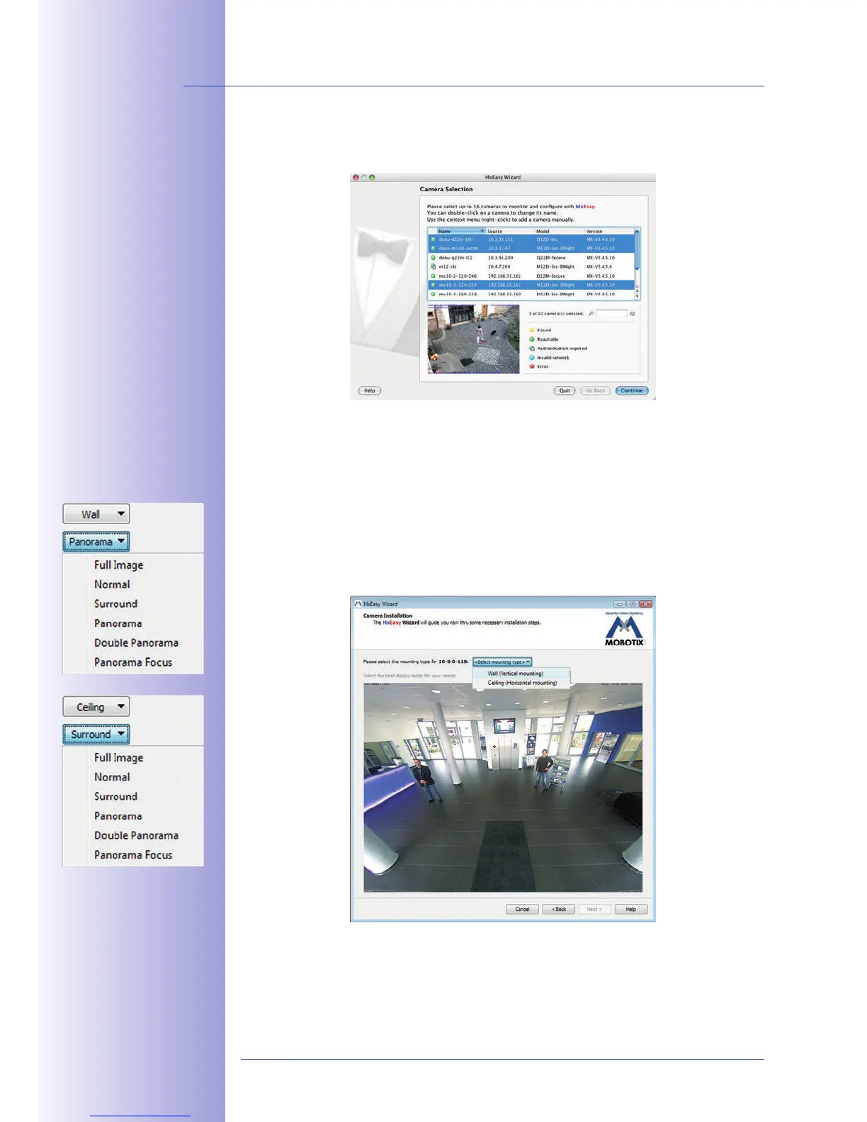 the mounting position and the desired image view of each camera (wall or ceiling). The