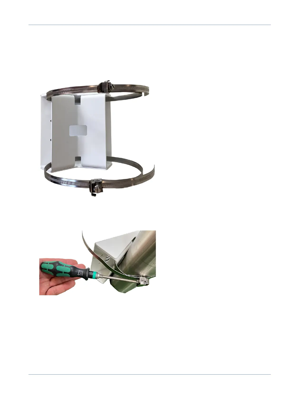 2. Tighten the stainless steel straps on the Pole Mount with a screwdriver. If necessary, the ends of the