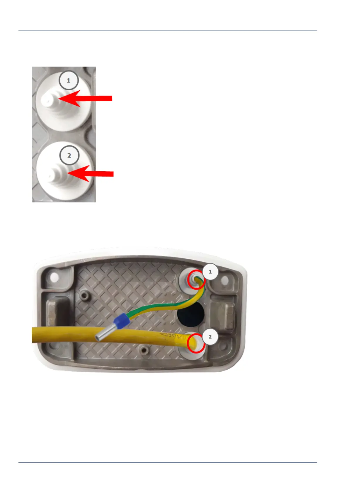 Guide the ground wire through the upper cable plug ① and the network cable through the lower cable