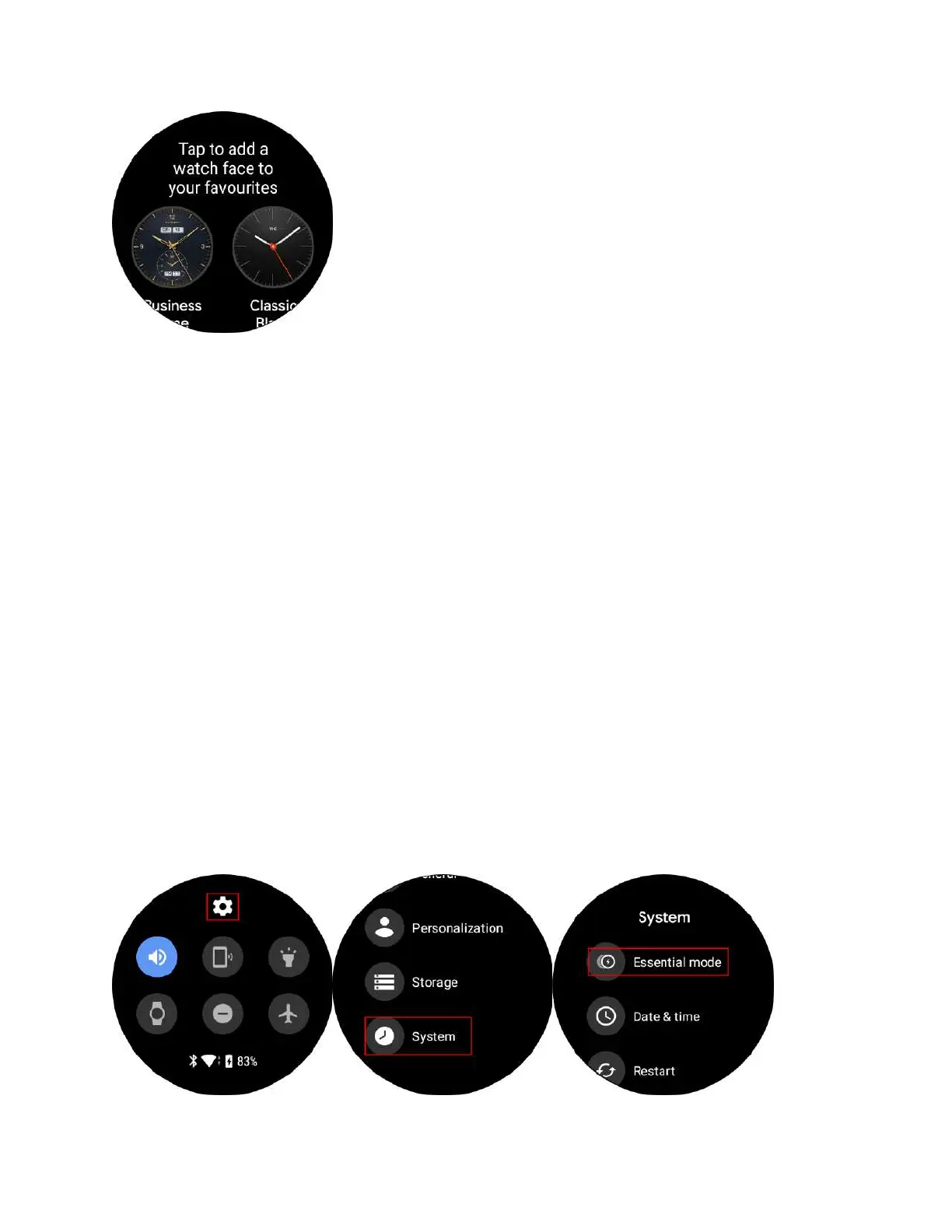 From the watch face, swipe down. Tap the setting icon. Tap System > Essential mode.