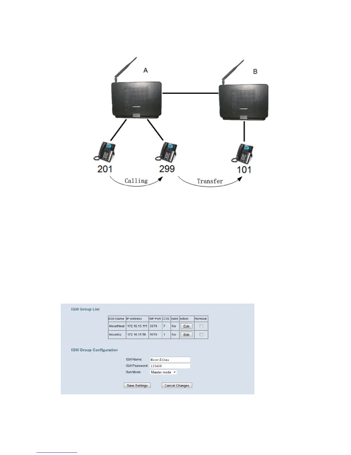 With this setting IG A’s Ext 299 can transfer a call from 201 to IG B’s Ext 101 by dialing 101