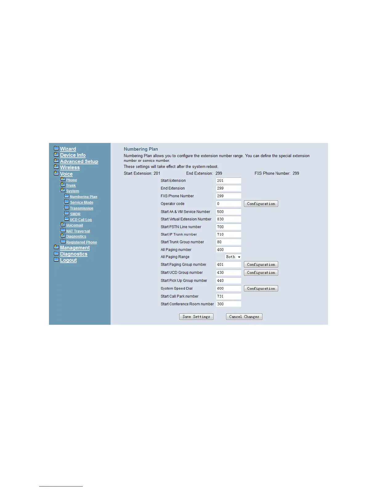 This page allows you to configure extension number range. You can also define some