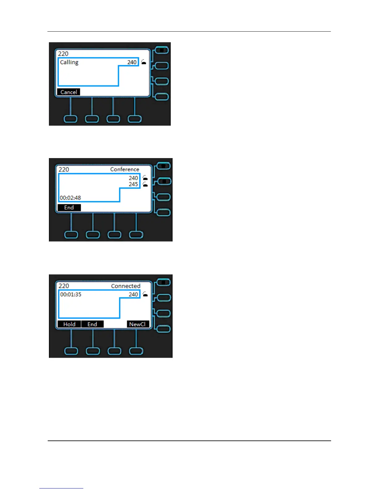 Talk Indication: If the phone is in talk status, the caller ID of other users and the talk time