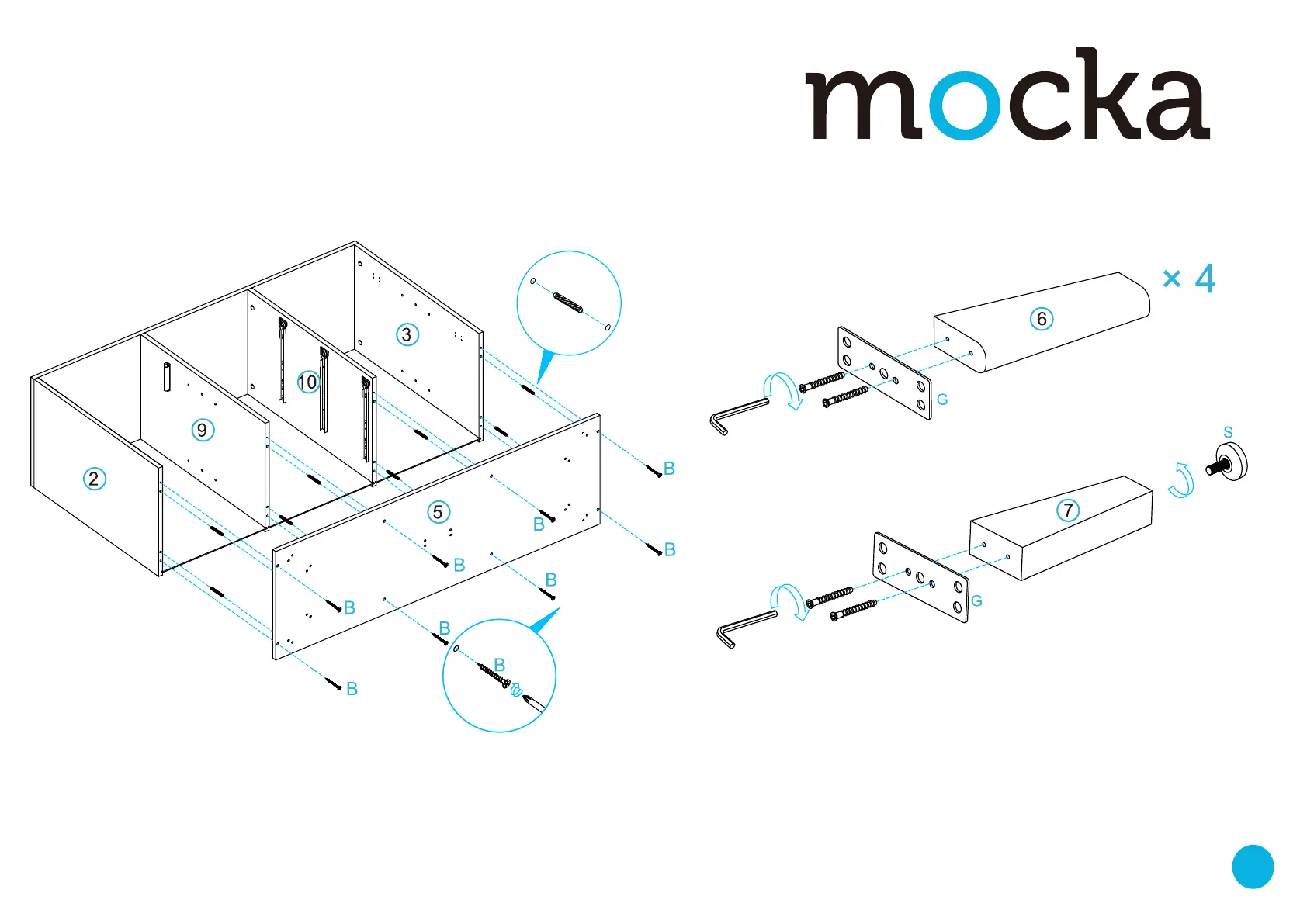 Attach 10 x screws (Q) and 5 x plates (G) to 4 x legs [6] and 1 x leg [7].