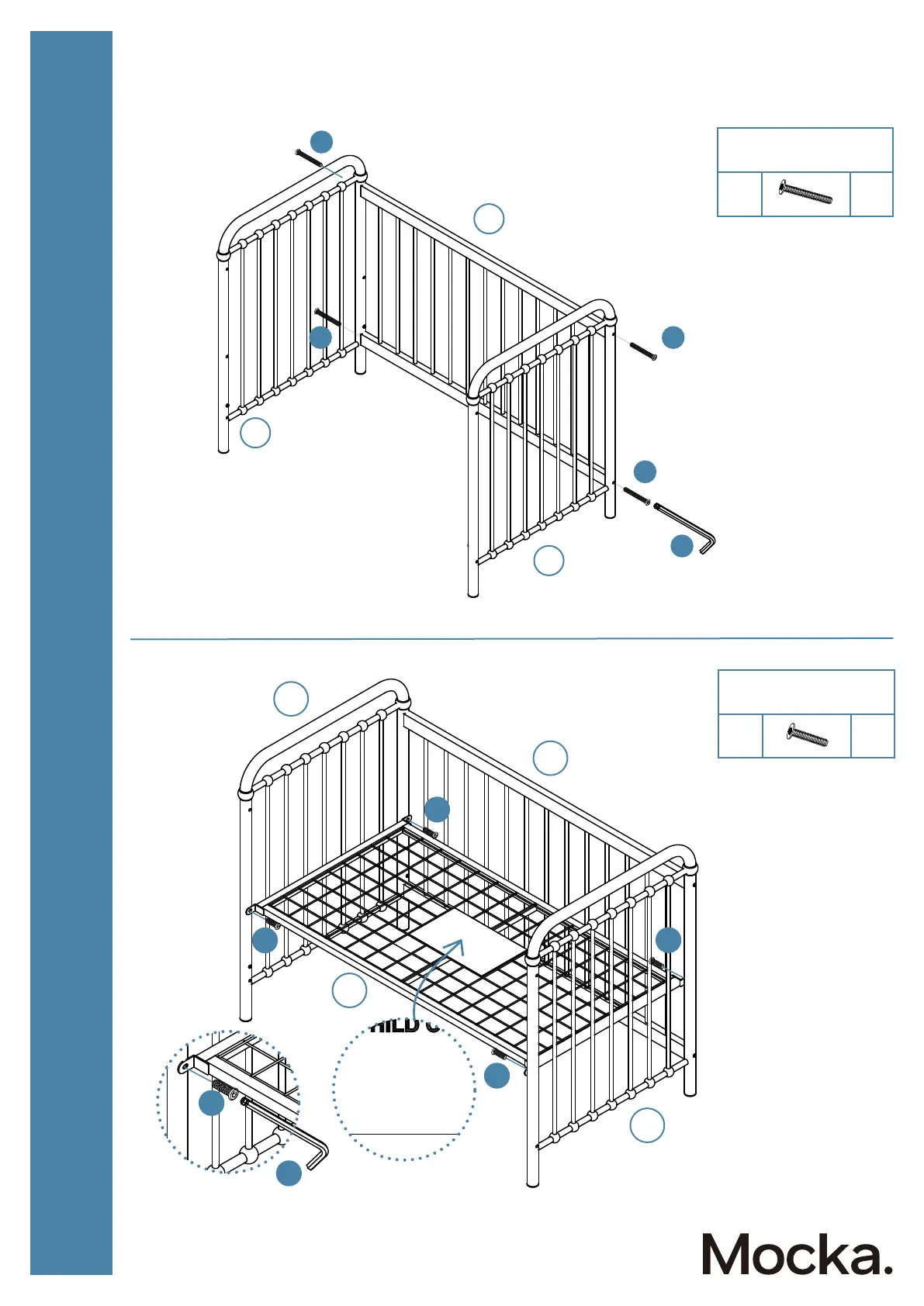 Mocka Sonata - Sonata Cot Assembly Steps; Step 1: Attaching End Panels; Step 2: Securing Side and Bottom Panels