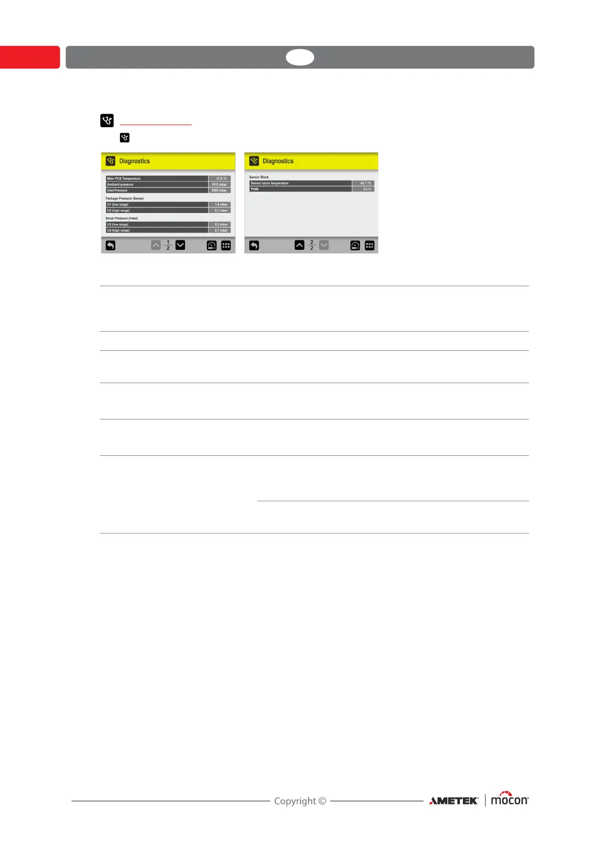The Diagnostics screen holds various internal device parameters.